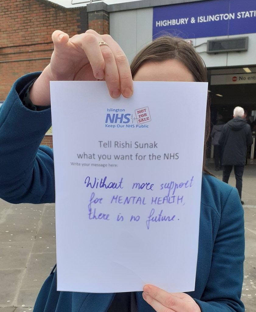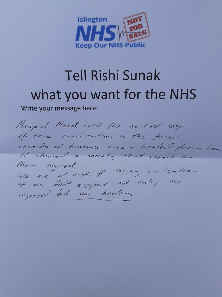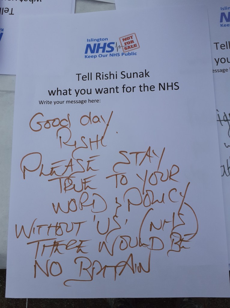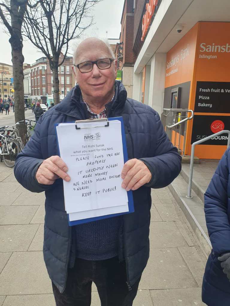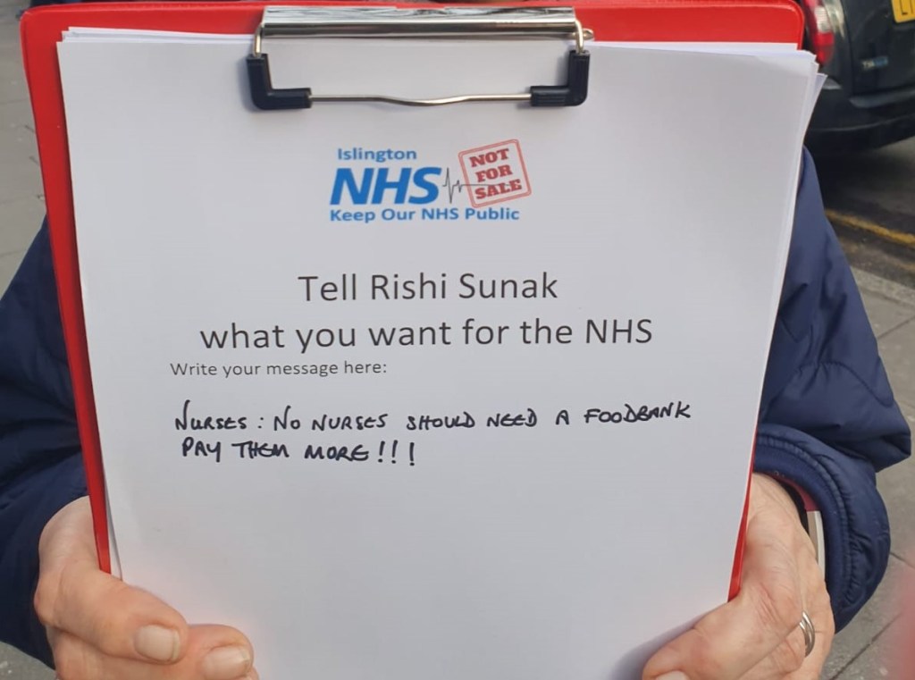 People in Islington told Rishi Sunak what they want him to do for the NHS as part of a national day of action held on 28 January 2023 to support striking NHS staff. The messages were loud and clear from all over the borough: start talking now to provide fair pay for staff and save our NHS. At Islington Keep Our NHS Public stalls at the Angel, Highbury Corner, Nags Head and Archway, you told the Prime Minister to hire more staff, pay them decent wages and treat them with respect. We know we can’t rely on their good will forever.